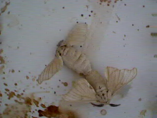 Some are still in the metamorphosis stage but I got the both cocoon and non-cocooned pictures! Some have even started reproducing! These silkworms are domesticated so they cannot fly but they still flap their wings a lot. 1 and 2: This is what they look like in their cocoons, the will lose their dark outer shell when they're ready to turn into moths. 3: The one on the bottom right corner is flapping his wings. 4 and 5: The mating has begun, the female and male sticks to eachother's opposite ends. 7. Top view. Not visible: Rare moth, head still of silkworm instead of two antennae like bangs. |